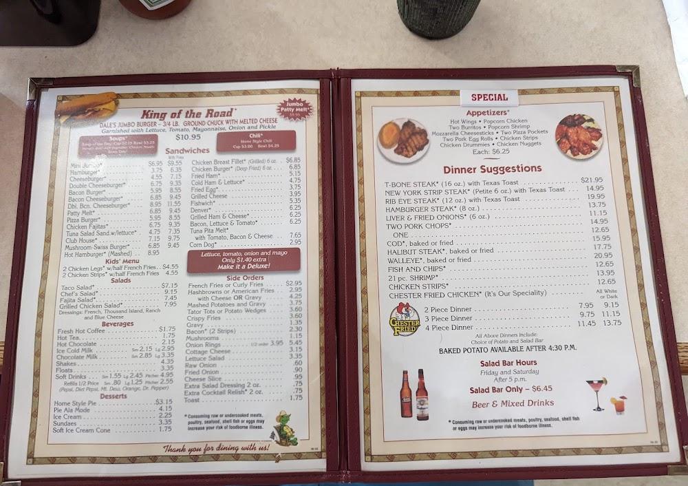 Dale's Cafe showcases a diverse menu featuring classic American comfort food. Breakfast highlights include hearty omelets, pancakes, and biscuits. Lunch offers satisfying sandwiches, including the double cheeseburger and Chick-fil-a sandwiches. You'll find salad options like the Fajita Salad and Taco Salad. Evening diners can enjoy chicken dinners and daily specials featuring local favorites. Unique to Dale's is a standout list of pizzas, such as breakfast pizza and meat lovers. Their kid’s menu ensures there's something for everyone. Overall, the menu satisfies cravings at any time.